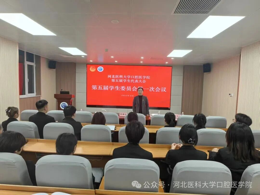 为总结过去工作成就,展望未来发展,河北医科大学口腔医学院第五届学生代表大会于2025年12月31日下午5:30在口腔医院9楼学术报告厅召开。学院党委书记李增宁,副院长刘庆,团委副书记张瑶、韩丽红及各年级60名学生代表出席参加。