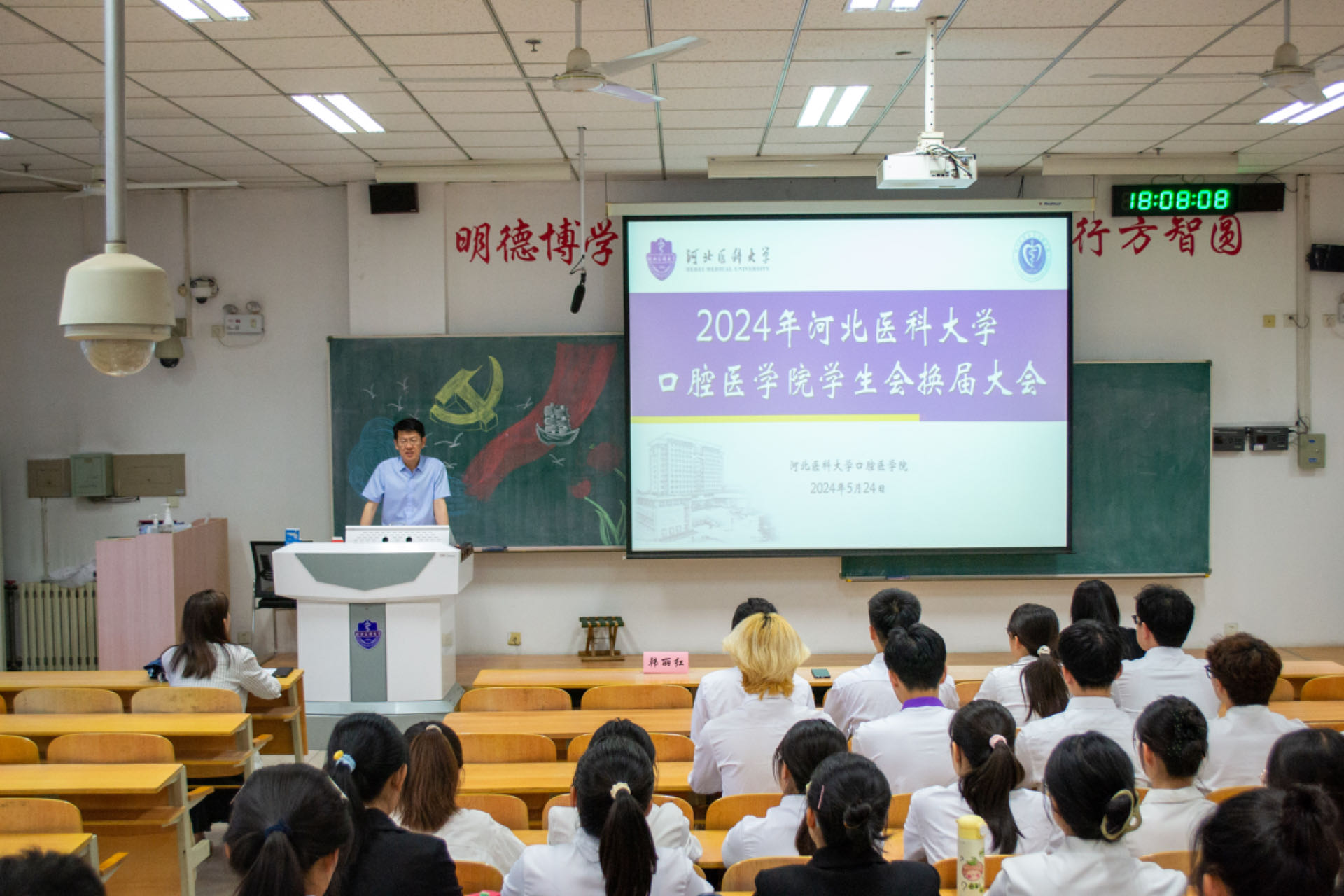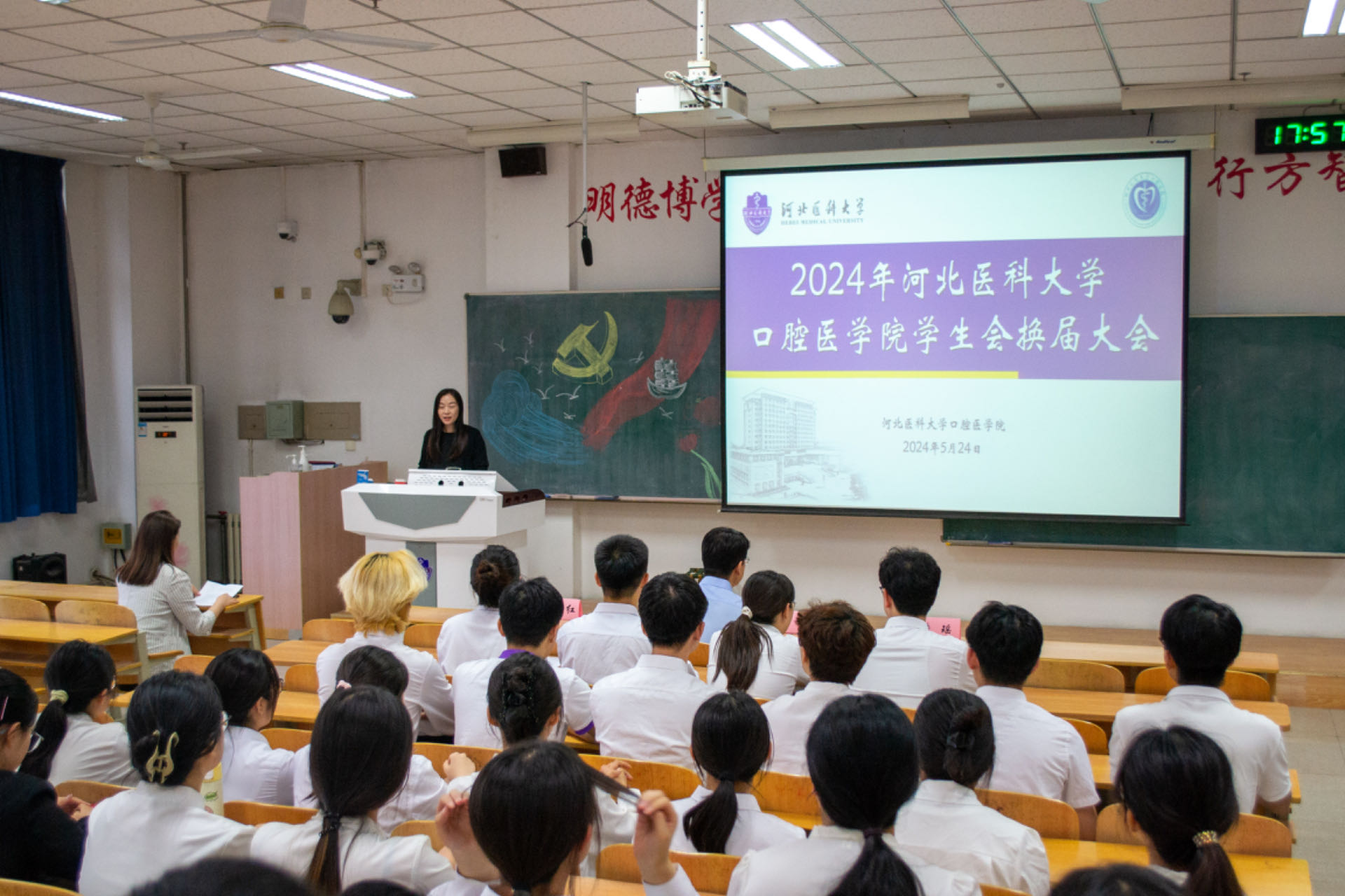 为进一步加强学生组织队伍建设,更好地服务于广大同学,5月24日,河北医科大学口腔医学院学生会换届大会在东教学楼17教室隆重举行。参加此次大会的人员有:口腔医(学)院副院长的刘庆老师,团委副书记张瑶老师、韩丽红老师以及全体学生会成员。